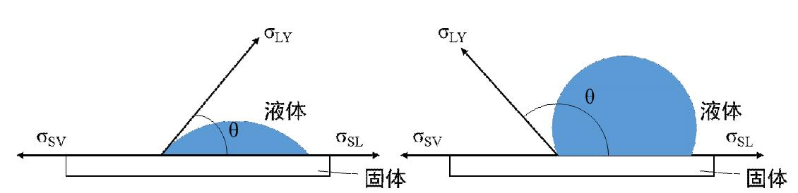 固體表面的微觀結(jié)構(gòu)與含有的化學(xué)成分對表面潤濕性的好壞有著很大的影響。固體樣品表面潤濕性的理論基礎(chǔ)主要有兩個(gè),分別為表面張力以及表面的自由能。