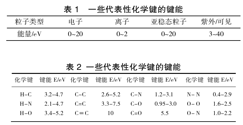在等離子體對材料表面進行改性的過程中,通常情況下通過撞擊材料表面,使材料表面原有化學(xué)鍵斷開以形成新的化學(xué)鍵。等離子體中各粒子能量參數(shù)范圍如表1所示,表2為各類材料中一些化學(xué)鍵鍵能。將二者對比得出:除離子外,等離子體中的大多數(shù)離子能量均高于表格中化學(xué)鍵鍵能。這表明,利用等離子體可以破壞材料表面的化學(xué)鍵而形成新的化學(xué)鍵。